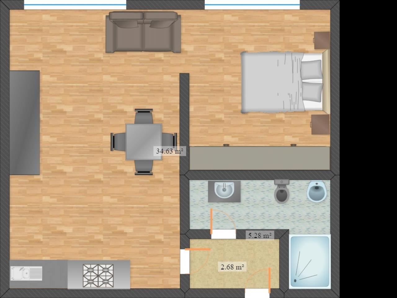 ingresso, locale soggiorno con cottura, camera matrimoniale, bagno con doccia.